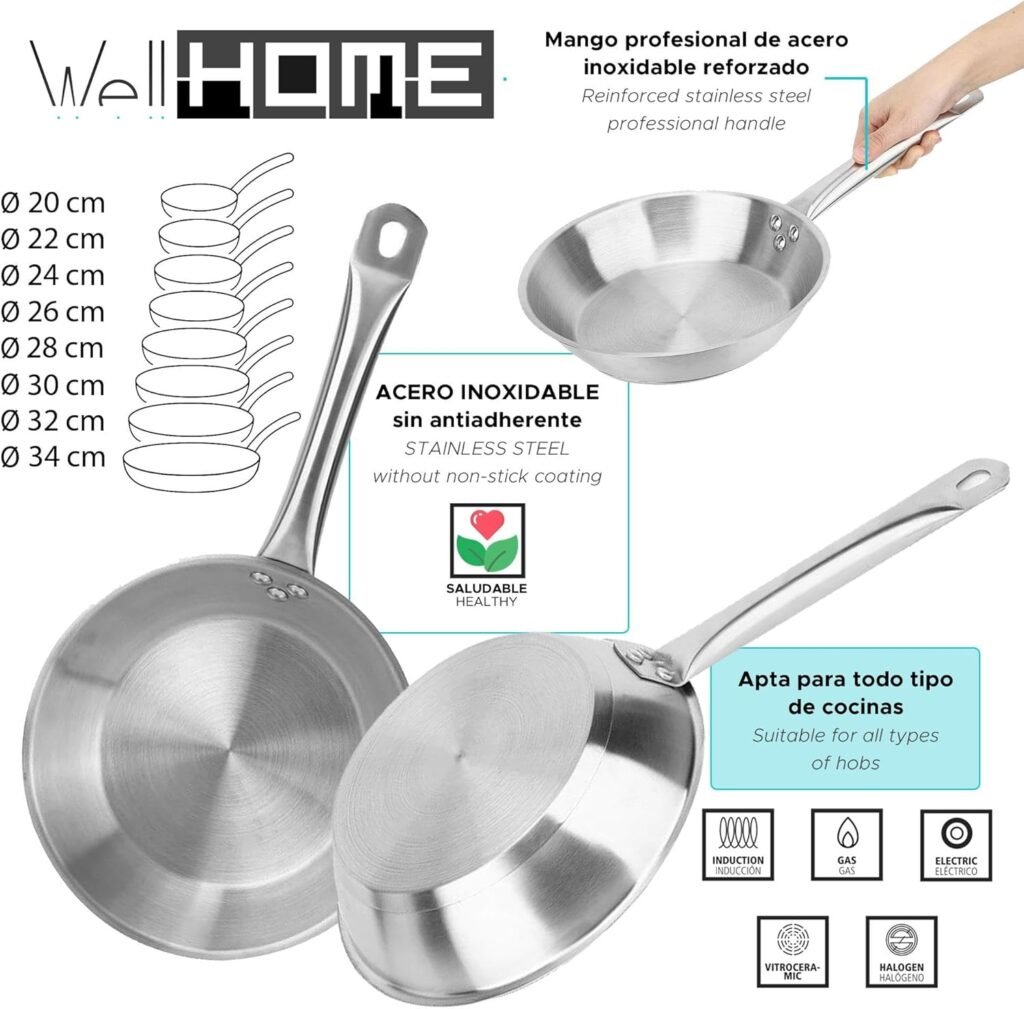 El set de 3 sartenes Well Home (Ø20, Ø24 y Ø28 cm) está fabricado en acero inoxidable de alta calidad, lo que garantiza una cocción uniforme y una larga durabilidad. Su diseño sin recubrimiento antiadherente permite una cocina más saludable, evitando la liberación de sustancias químicas al calentar. Además, son aptas para todo tipo de cocinas, incluyendo inducción, y cuentan con una base con núcleo de aluminio para una distribución homogénea del calor.