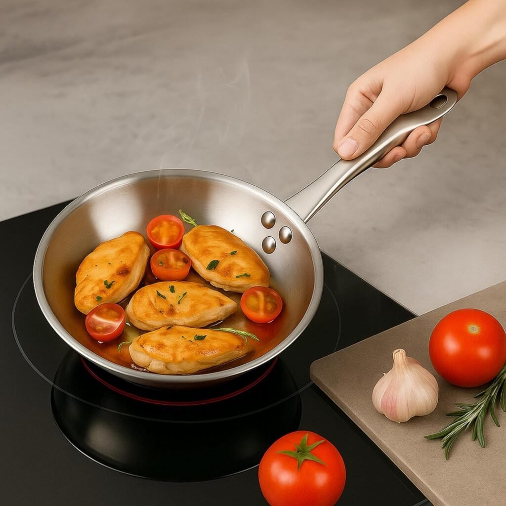 El set de 3 sartenes Well Home en acero inoxidable (Ø20, Ø24 y Ø28 cm) ofrece una cocción saludable y eficiente, sin recubrimientos antiadherentes, aptas para todo tipo de cocinas, incluyendo inducción.