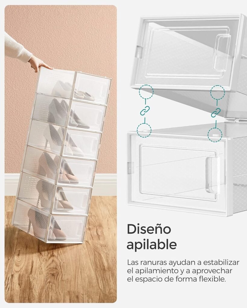 Diseño transparente y armónico: Fabricadas en plástico PP de alta calidad con una tonalidad blanca transparente, estas cajas permiten visualizar fácilmente el calzado y aportan un aspecto limpio y ordenado al espacio.