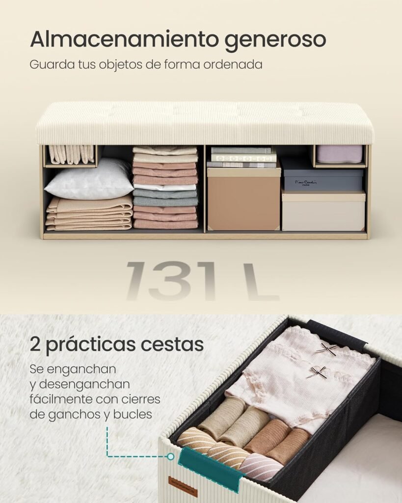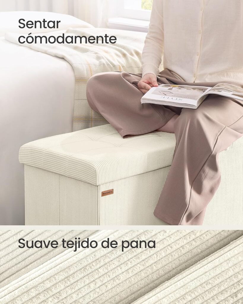 El SONGMICS Puff Almacenaje plegable es la solución perfecta para quienes buscan conjugar estilo, orden y funcionalidad. Un baúl robusto, de gran capacidad y diseño versátil que sirve como banco, puff reposapiés y espacio de almacenaje, ideal para salones, dormitorios o entradas modernas.