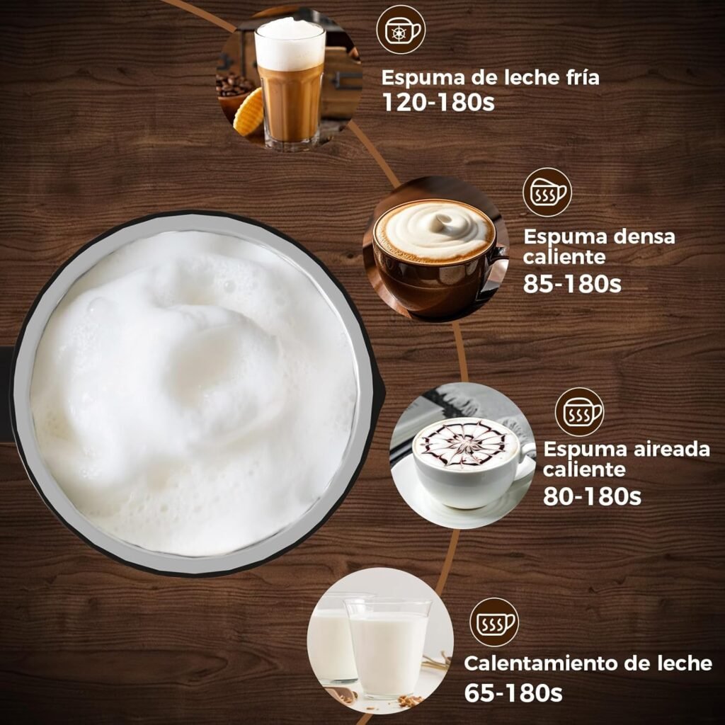 Multifunción 4 en 1: permite crear espuma densa caliente o fría, calentar leche y preparar mezclas cremosas como capuchinos, lattes, macchiatos o chocolate caliente con solo pulsar un botón.